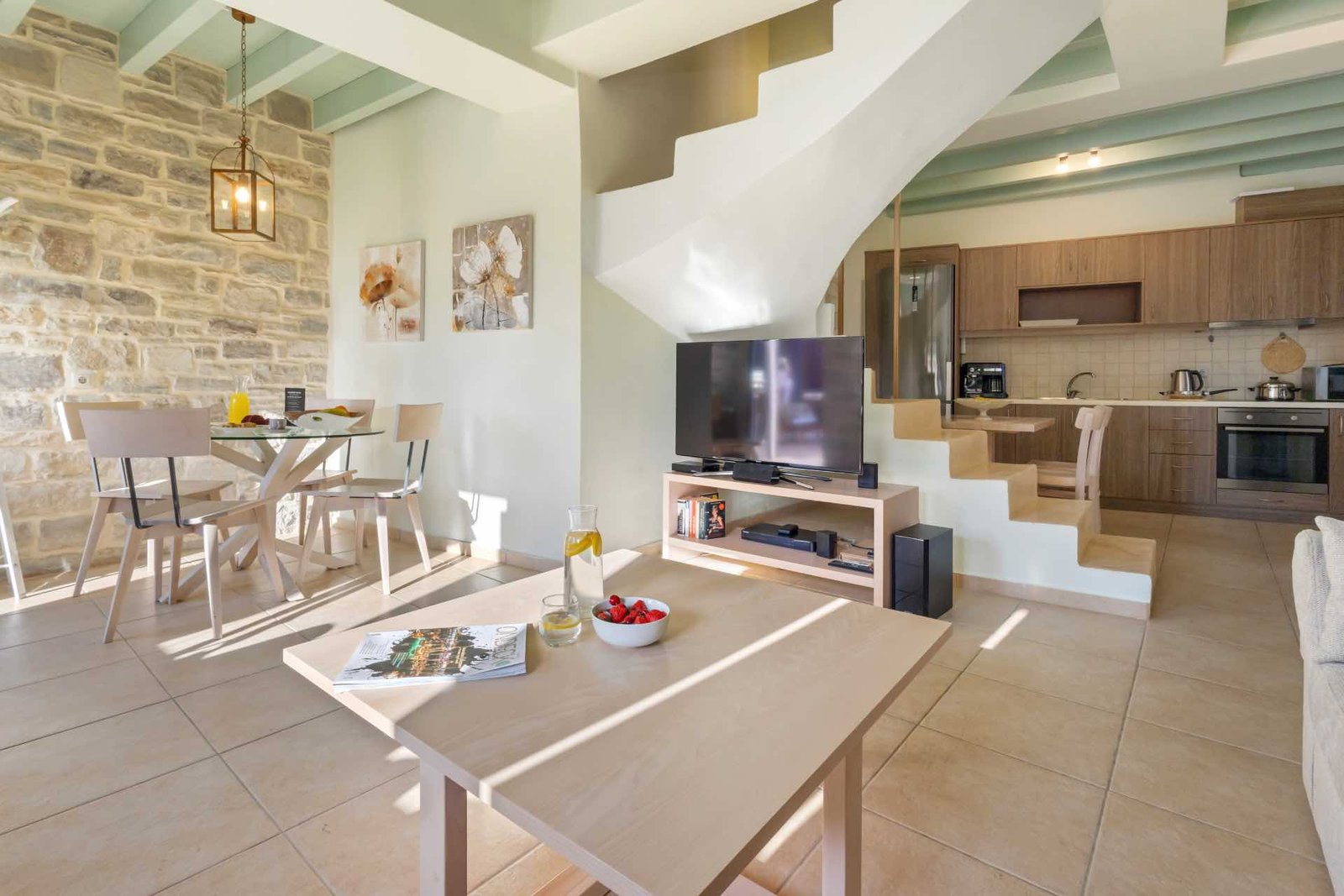 Im Erdgeschoss befindet sich eine voll ausgestattete, offene Küche mit einem geräumigen, traditionell eingerichteten Ess- und Wohnbereich.