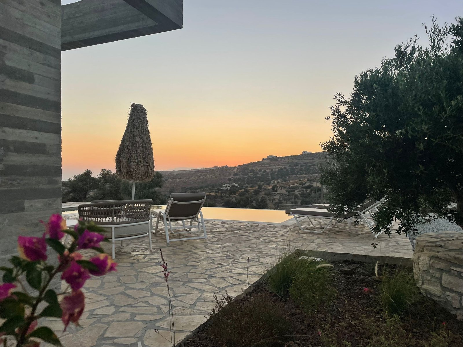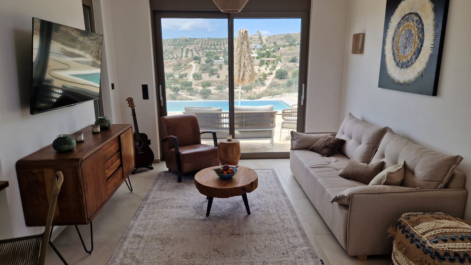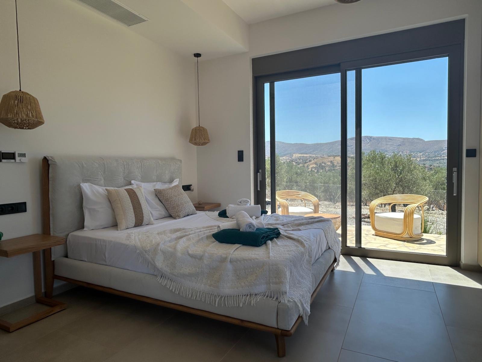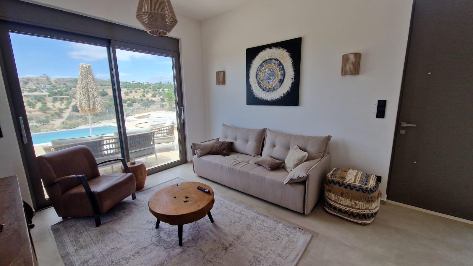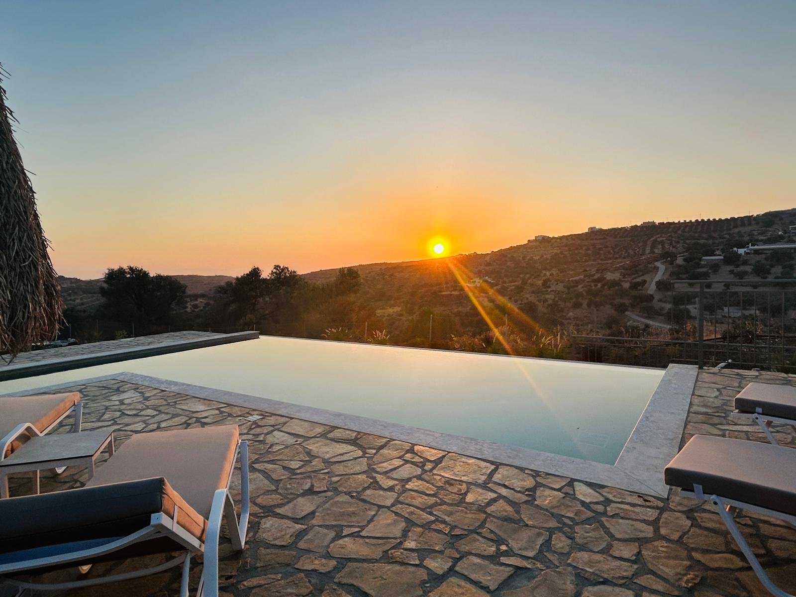 Nestled on a high plateau between the villages of Pitsidia, Kamilari and Sivas, and surrounded by more than 100 olive trees, it offers breathtaking panoramic views of the mountains, the Messara plain and the sea – a true haven of relaxation.