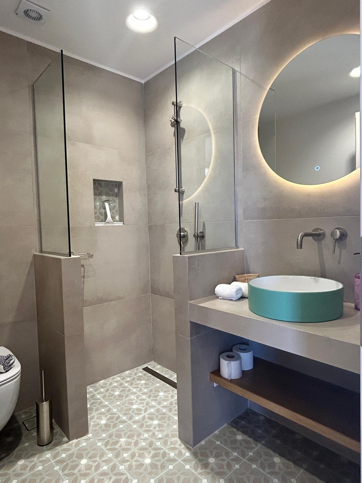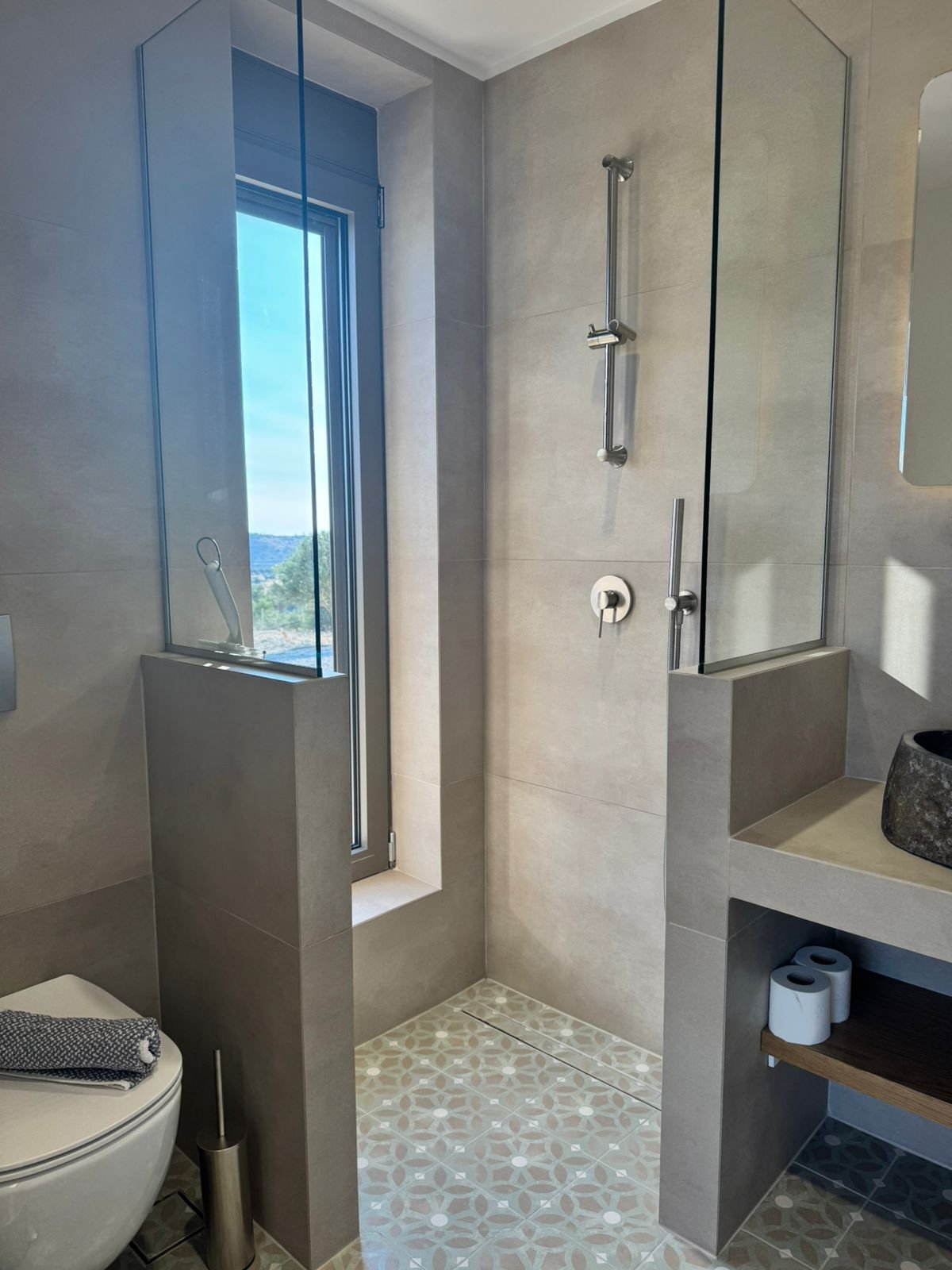 The spacious outdoor area invites you to unwind with a variety of cozy spots: sunny and shaded corners, a comfortable lounge, and an 8 x 3.5 m infinity pool with waterfall effect.