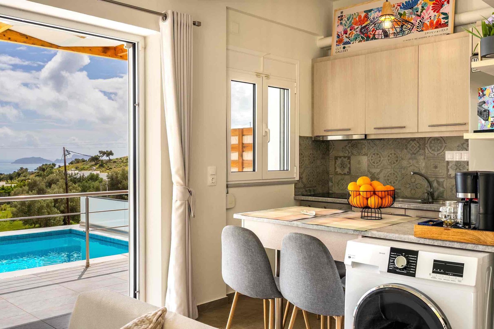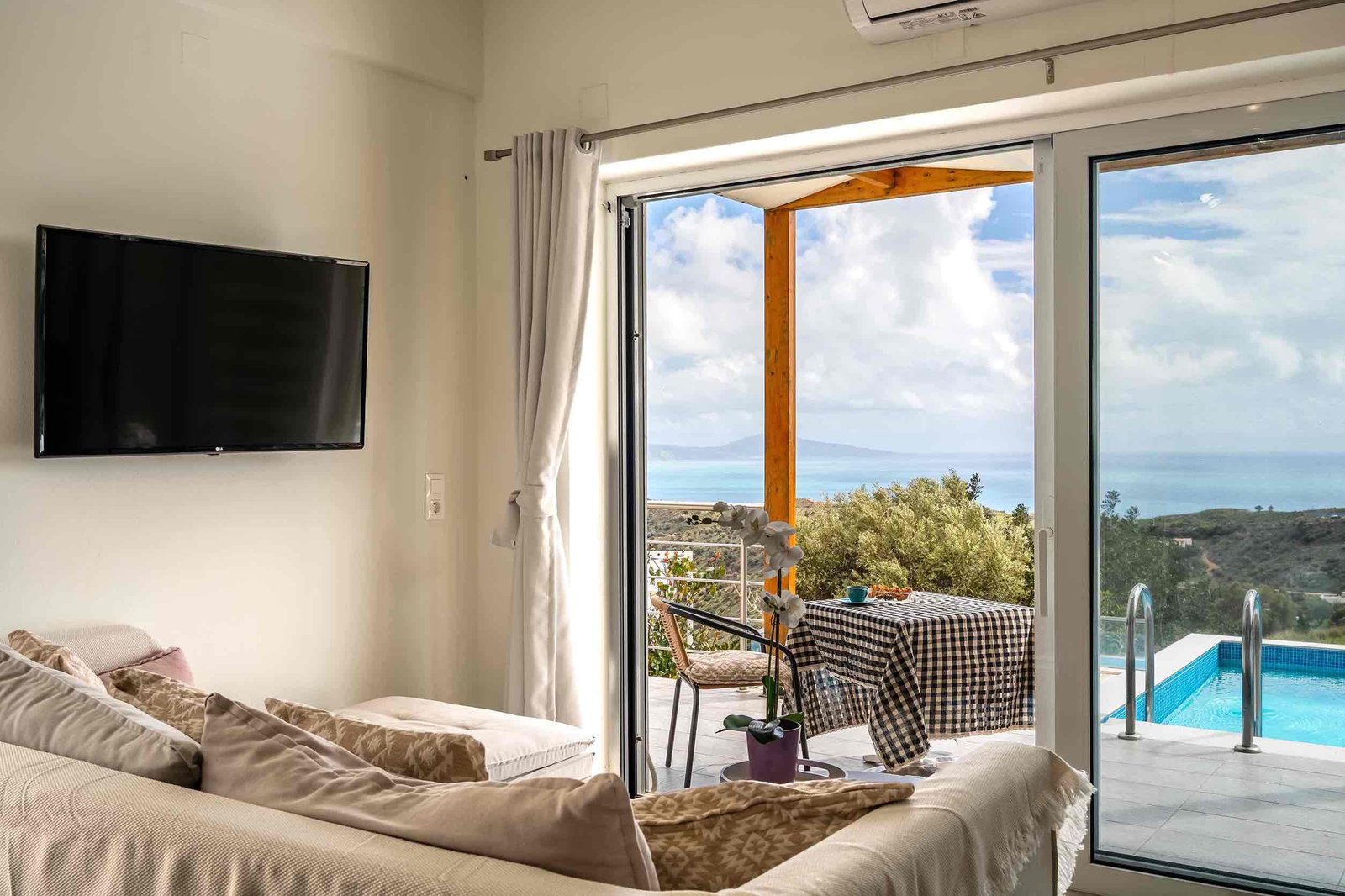 The villa features two comfortable bedrooms, a cozy living area, a fully equipped kitchen, and a private swimming pool with stunning views of the sea and mountains. Guests can relax on the spacious terrace, enjoy outdoor dining, and experience complete privacy in a peaceful environment.