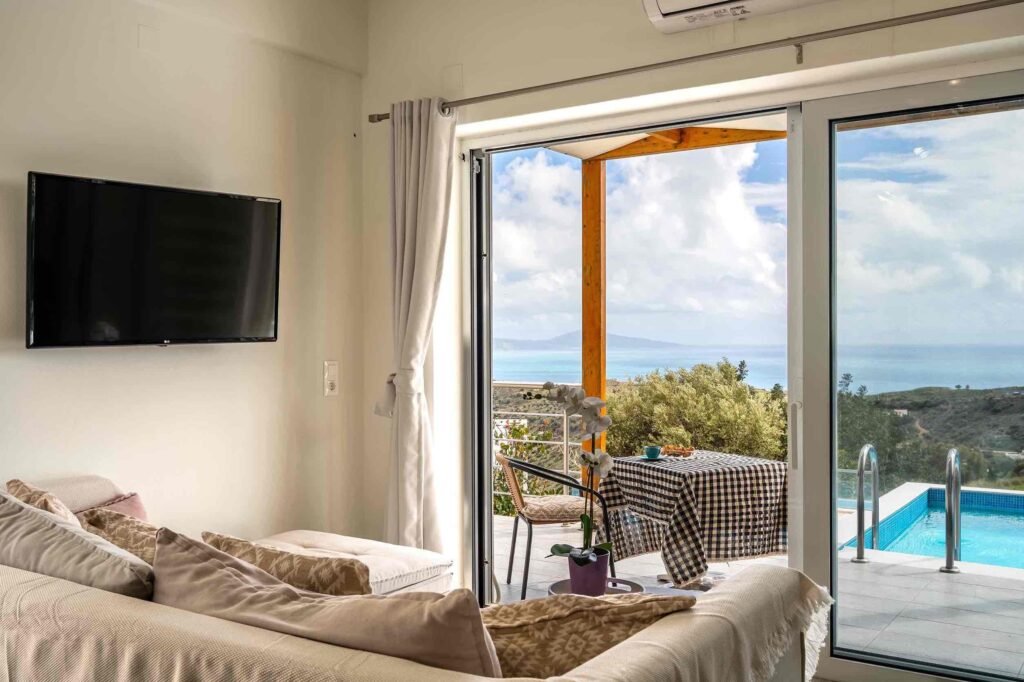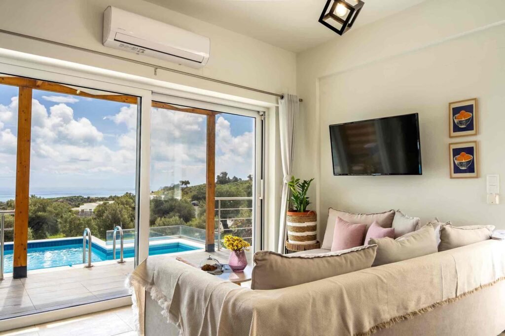 Enjoy comfort and privacy in this brand-new villa with stunning sea and mountain views, just minutes from the famous Komos Beach. The two-level home features 3 bedrooms, 3 bathrooms, a fully equipped kitchen, air conditioning, flat-screen TVs, free WiFi, and all essentials including towels and linens. Relax by your private 30 m² pool with sun […]